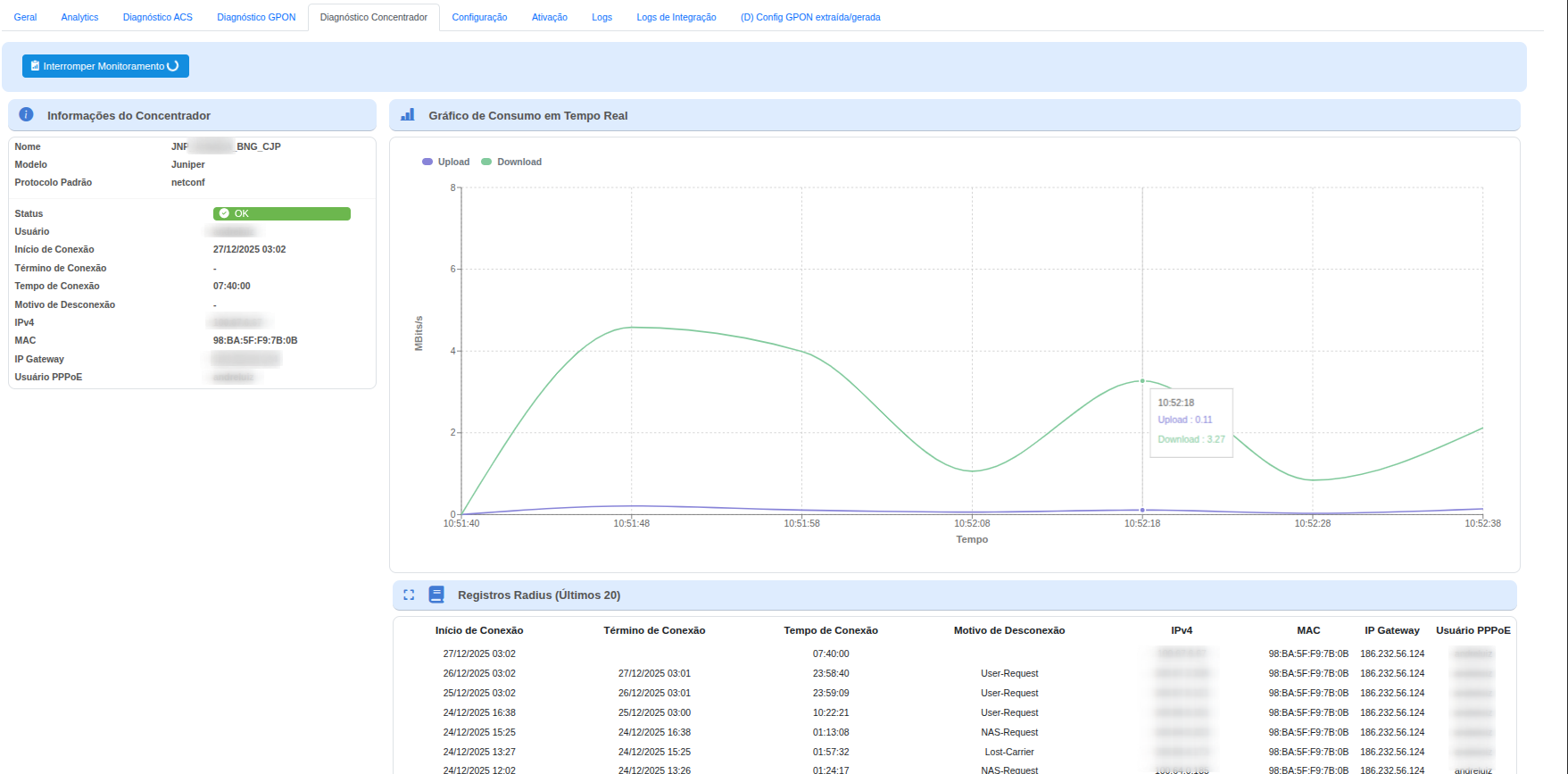O Diagnóstico do Concentrador é um recurso avançado do portal Int6, disponível exclusivamente para concentradores Juniper, que permite acompanhar em tempo real o estado da sessão do assinante, consumo de banda, histórico de conexões PPPoE e informações técnicas do equipamento de borda.
