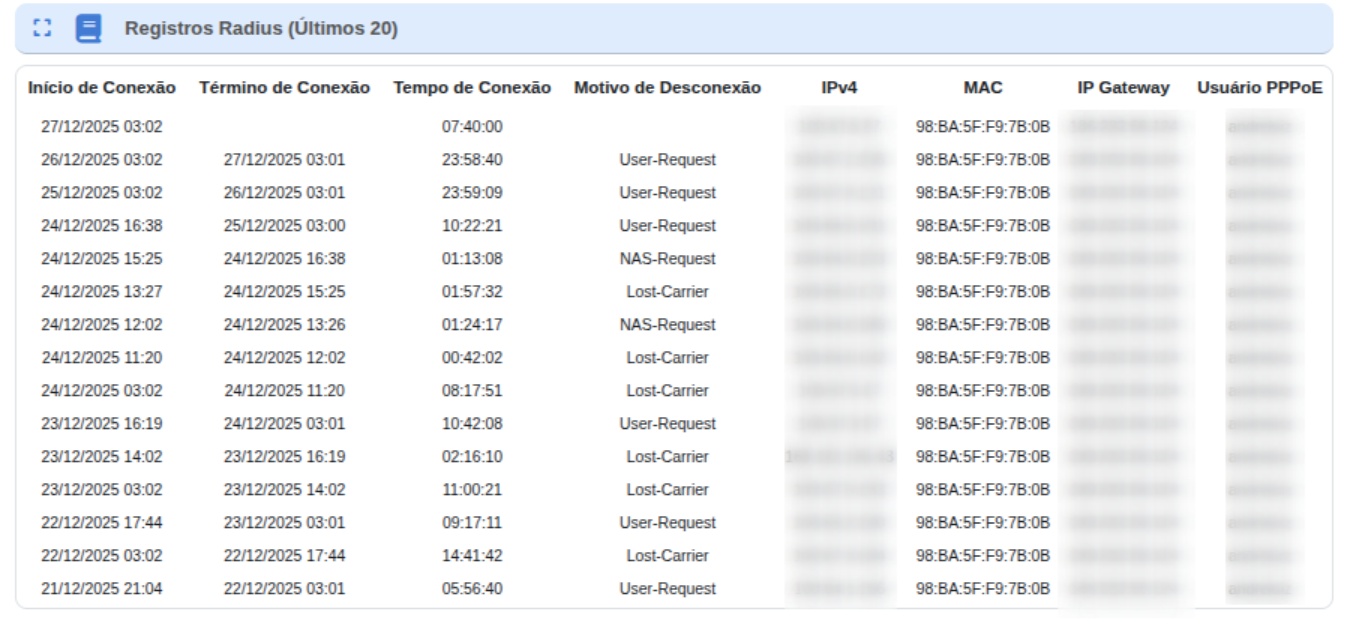 Este painel apresenta o histórico recente de conexões PPPoE, permitindo identificar quedas, reconexões e comportamentos anormais.