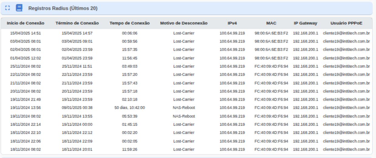 A seção Registros Radius apresenta o histórico das últimas 20 conexões PPPoE do assinante registradas pelo servidor RADIUS.
