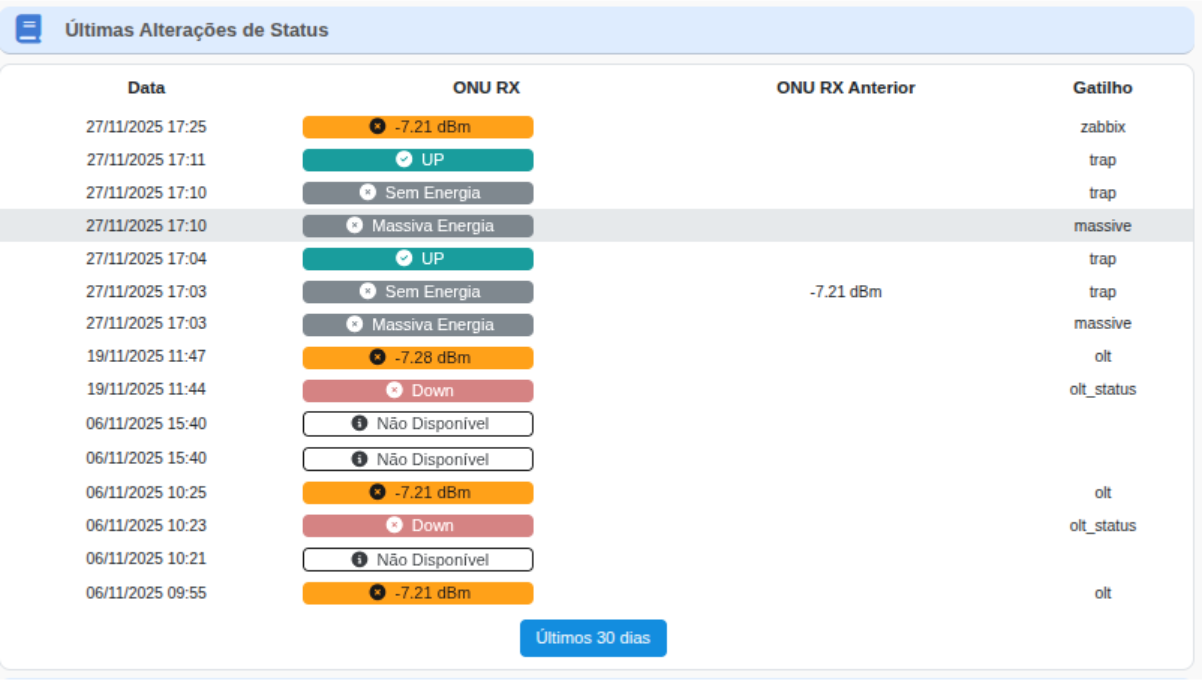 • -7.21 dBm (potência válida) • UP (ONU voltou a responder) • Sem Energia (dying-gasp) • Massiva Energia (queda coletiva por energia) • Down (ONU offline) • Não Disponível (sem leitura vinda da OLT) |